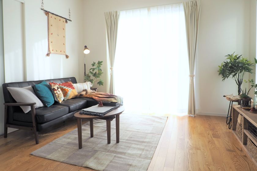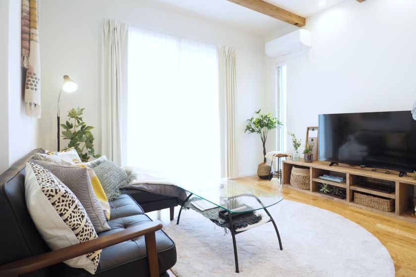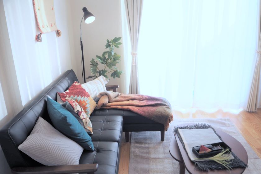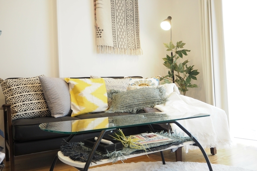 もともと置かれていた黒のソファとテレビボードに、季節感のあるクッションや小物、インテリアグリーンを使用してスタイリングさせていただきました。