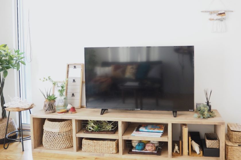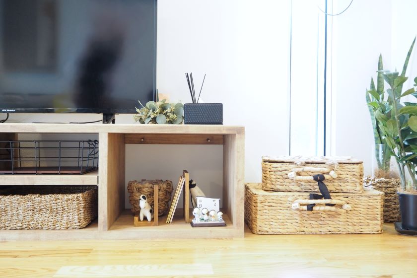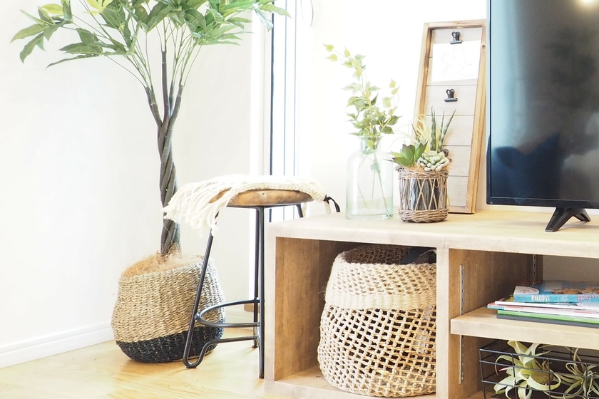 収納も兼ねた天然素材のバスケットが、無機質になりがちなテレビ周りにナチュラルな印象を与えています。
