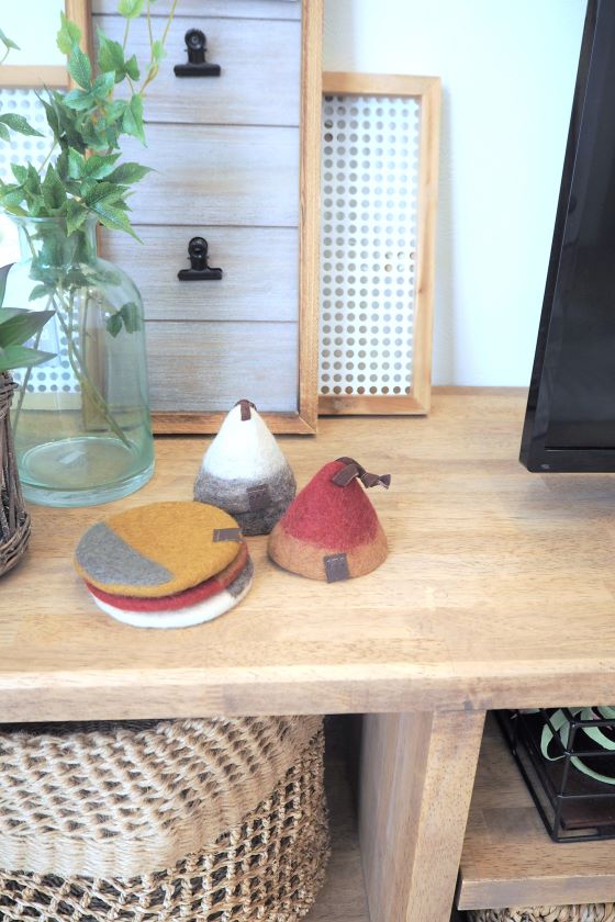 秋冬仕様へ模様替え。クッションカバーや壁のタペストリーを温もりのある素材に替え、テレビ周りにもウールの小物をプラスしました。