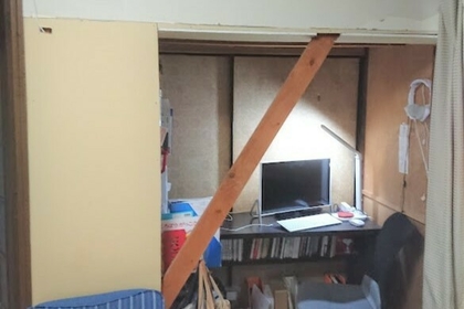 ビフォー 壁に穴が開けられたままの状態で、押入れの襖も見えています。
