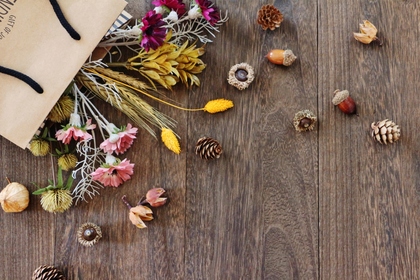 秋色は、落ち葉の赤や黄金色、かぼちゃの緑とオレンジ色、木の実の茶色。